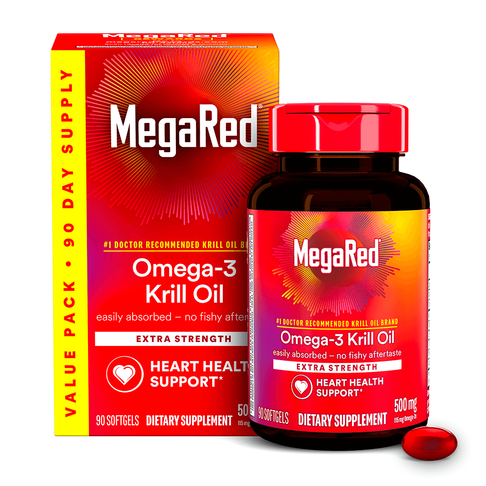 MegaRed 500 mg Extra Strength Omega-3 Krill Oil supplements provide a combination of omega-3 fatty acids – EPA and DHA. that support your heart in a once daily softgel.* It also has naturally occurring antioxidant- astaxanthin. known to give krill its red color.