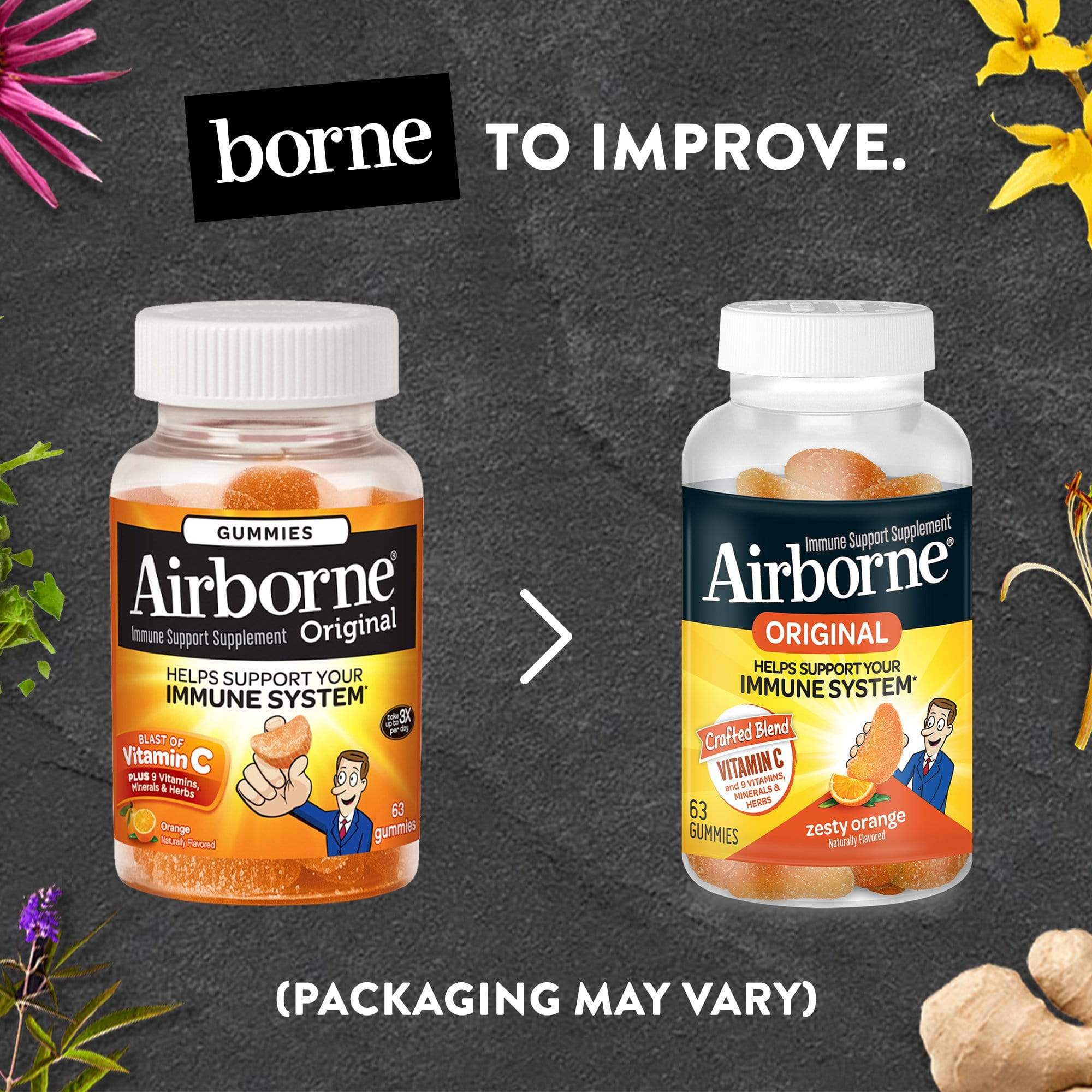 Airborne Immune Support Gummies have a crafted blend of Vitamin C and 9 other vitamins. minerals and herbs to help support your immune system in a delicious. and easy-to-take gummy form*. Each serving (3 gummies) provides 750 mg of Vitamin C.